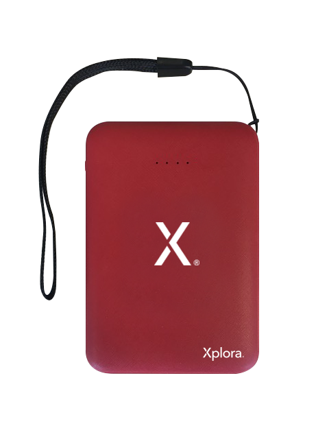 Oplad dit Xplora og andre enheder på farten med vores Powerbank, som kommer i et lækkert rødt design.